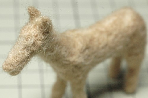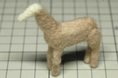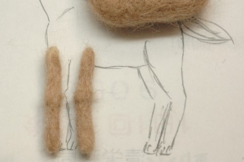 足の長さがそろったところで、後ろ足と胴体の継ぎ目に薄茶色の羊毛フェルトを足して滑らかにつながるように形を整え・・・