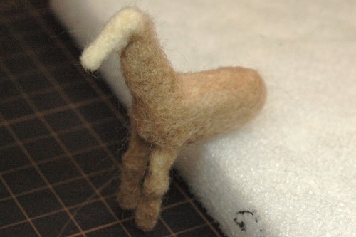 さらにその先にも薄茶色の羊毛フェルトを被せ、太ももに接続しました。また、胴体後部に後ろ足を取り付けるため、ニードルでつついてへこませました。