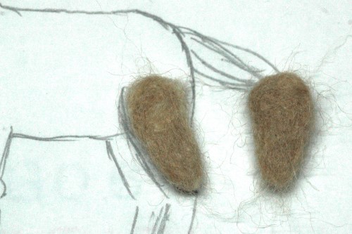 羊毛フェルトを三角形にまとめ、耳を2つ作りました。