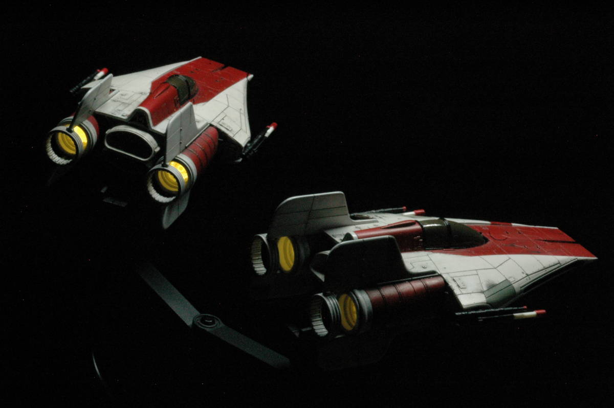 最初に作った4機のうち2機は、ボックスアートのイメージで塗装しました。1機はグレーの部分がない状態、もう1機はグレーの部分を追加した状態としました。グレーを追加した機体は、1/72の「Aウィング」や書籍の写真も参考にしました。
