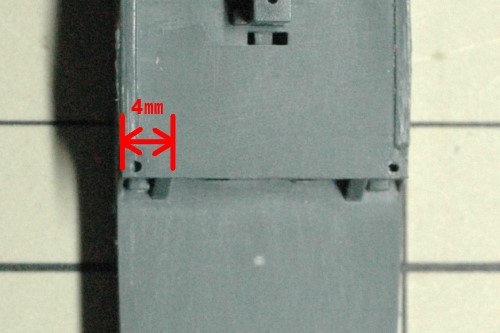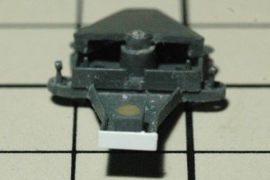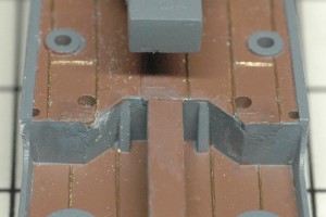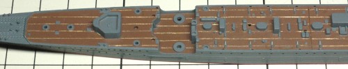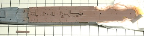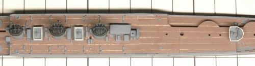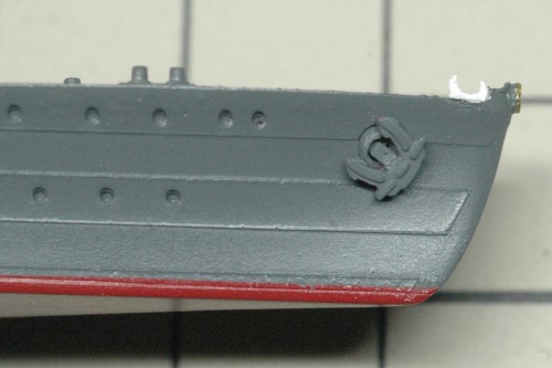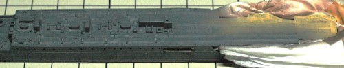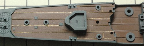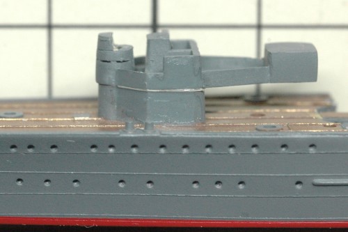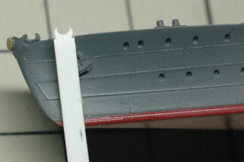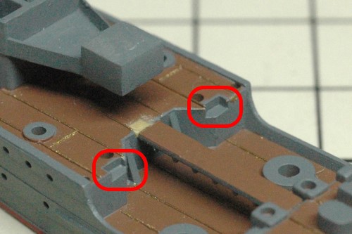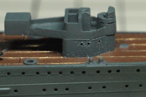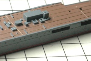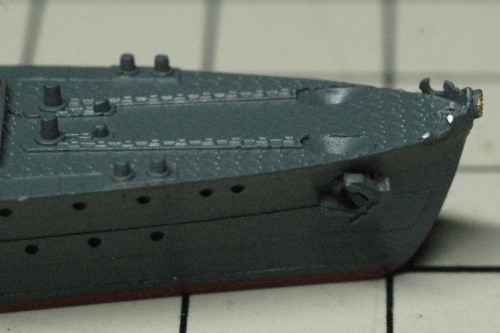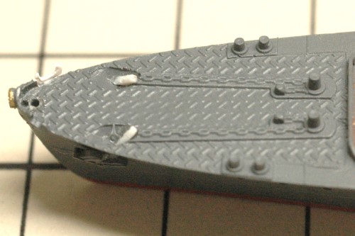同様に、船首楼甲板の後端も塗装を行う前に埋めておくべきでした。この部分はパラベーンのパーツを取り付けるため切り欠かれていますが、実物では切り欠かれていません。