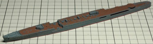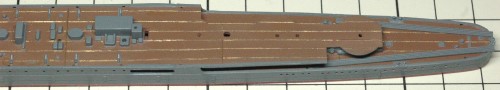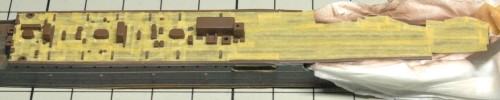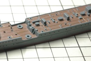 後部セルター甲板には裏側からC602「佐世保海軍工廠標準色」を塗り、船体に接着。継ぎ目を埋めて、縦方向のリノリウム押え金具を接着しました。