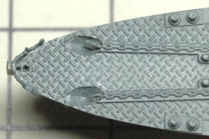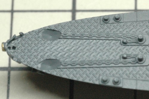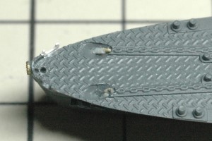 ところで、夢中になってリノリウム押え金具を塗っていて、気が付いたら艦首を損傷してしまっていました。
