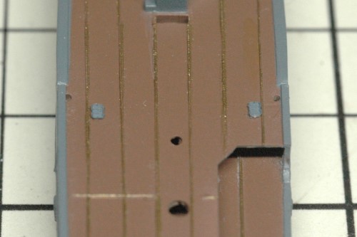 プラバンとエポキシパテで埋め、C602「佐世保海軍工廠標準色」とC606「リノリウム色」を筆塗しておきました。