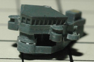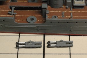 ところで、書籍の図面には前部魚雷発射管が後ろ向きに描かれている場合があります。そこで、試しに後ろ向きに取り付けてみようと思いましたが、発射管の先端が船体と干渉してしまいました。