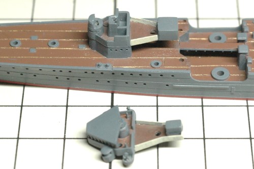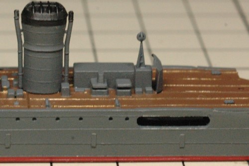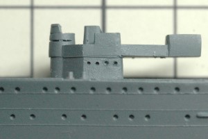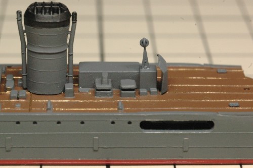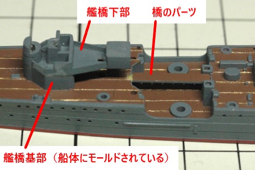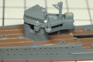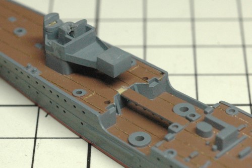 艦橋下部のパーツに「佐世保海軍工廠標準色」を塗り、船体にモールドされた艦橋基部の上に接着。やすりとナイフで削って継ぎ目の形を整えました。