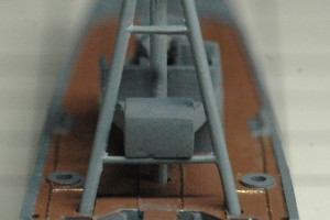 そして艦橋上部を接着。船首楼甲板後端にはパラベーンも接着しました。