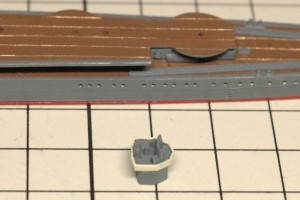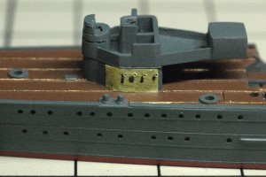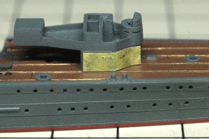 後部上甲板前端のラッタルのモールドの上に取り付けました。ハッチの前端が後部セルター甲板の前端に、また内側が舷側から4㎜の位置になるように取り付けると、ちょうどラッタルの上に配置出来ます。