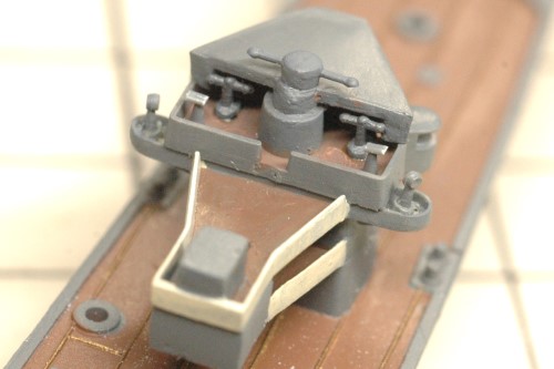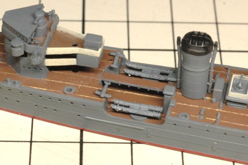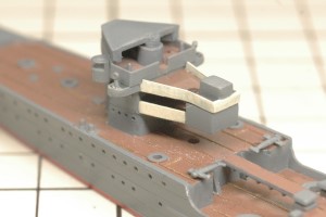 煙突、セルター甲板の測距儀はキットのパーツをそのまま使用します。また、「球磨」の後部セルター甲板には後部艦橋が設置されています。これはキットのパーツから切り出しました。