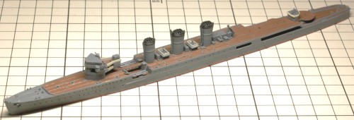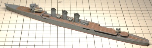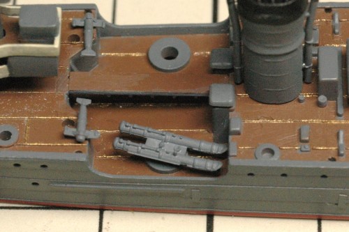 リノリウム押え金具の塗装も無事に終わり、船体に艦橋や煙突などを取り付けることが出来ました。