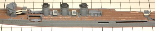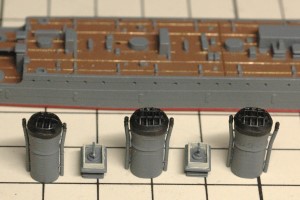 また、組み立てて保管しておいた煙突、セルター甲板から切り出した後部艦橋なども塗り分けて接着しました。