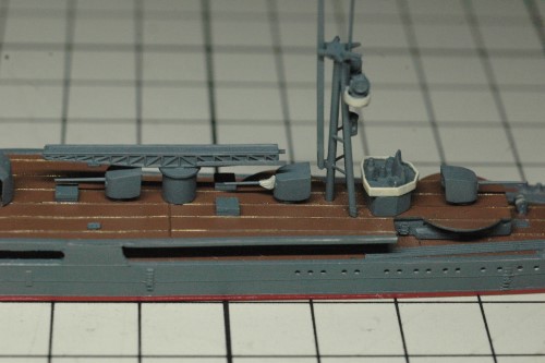 そして、主砲、8㎝高角砲、カタパルト、後部マストなどを組み立て、これらをクレオスC602「佐世保海軍工廠標準色」で塗装しました。