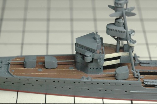 次に後部セルター甲板に主砲、カタパルト、後部マストなど各部品を接着。後部マストのデリックは、はめ込んだだけなので動かすことが出来ます。