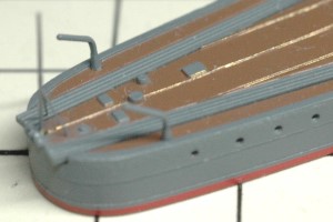 この大型化されたボートダビットは舷側に取り付けられています。そこで、左舷一番後ろのダビット取付穴をエポキシパテで埋め、「リノリウム色」を筆塗しておきました。
