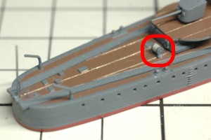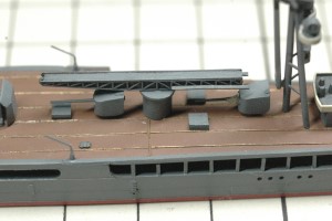 ダビットは甲板上の8カ所に接着する場所があるのですが、1カ所は後部セルター甲板を拡張した部分の下なので接着できず、残り7カ所に接着しました。