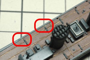 ところで、これまでボートダビットはキットのパーツを使用するつもりでした。そのため、甲板上のダビット取付穴は埋めずに残していました。