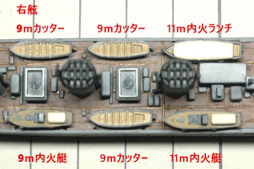 そこで、ボートダビットが大型化された場所には11m内火艇が搭載されているものと推定。さらに、キットの組み立て説明書も参考にして、艦載艇の構成を以下のように仮定しました。