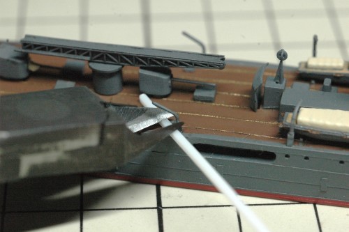 また、主砲は船首楼甲板にも接着。船首楼甲板の後端にダビットを接着しました。