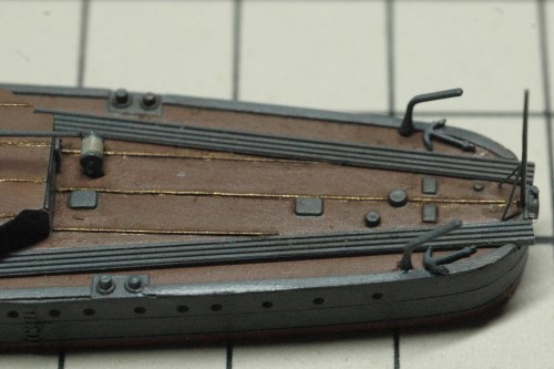 塗装して組み立てた後、右舷の甲板の一番後ろに接着しました。