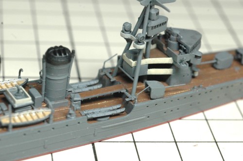 タミヤの軽巡洋艦「球磨」を製作しています。今回は甲板に前後のマスト、カタパルト、武装などを取り付けました。